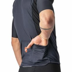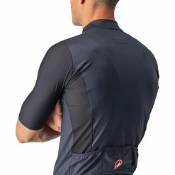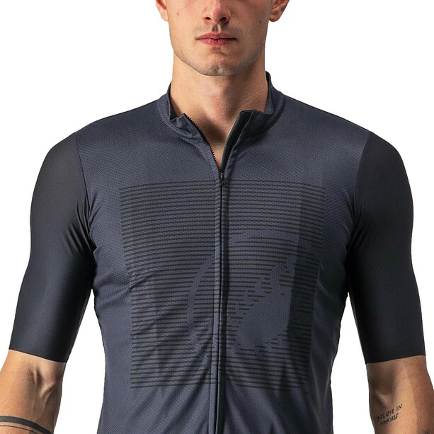 Nicht Ihr Standard-Grafik-Trikot. Castelli verwendet stückgefärbte Stoffe für eine satte Farbsättigung, aber nicht nur einen einzigen Stoff. Das Hauptteil des Trikots ist mit Castellis ProSecco-Behandlung ausgestattet, um dich trockener zu halten, die seitlichen Mesh-Einsätze sorgen für zusätzliche Dehnung und Belüftung und die Ärmel sind aus dem Vier-Wege-Stretch Velocity Rev2-Gewebe, das direkt vom Aero Race 6.0-Trikot des Tour de France-Siegers übernommen wurde. Es ist ein hochleistungsfähiges Trikot. Die Grafik wird auf der Vorderseite im Sublimationsverfahren aufgebracht, aber in diesem Fall ist es ein Überdruck auf dem gefärbten Stoff, der für einen satteren, subtileren Look sorgt. Der Grafikblock auf der Vorderseite erinnert an ein Siebdruck-T-Shirt, so dass du eine Grafik im Stil eines T-Shirts auf einem Hochleistungstrikot vorfindest.