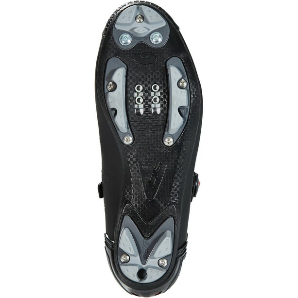 Carbonfaserverstärkte Nylonsohle mit Profileinsätze aus Kunststoff im Fußspitzen-, Mittelfuß- und Fersenbereich für beste Performance in Schiebe- und Tragepassagen. Die Einsätze sind austauschbar um eine möglichst lange Nutzungsdauer des Schuhs zu gewährleisten. Austauschbare Gewindeeinsätze im Cleatbereich. Gewindeeinsätze für optionale Stollen. Kompatibel mit allen gängigen MTB-Pedalsystemen.